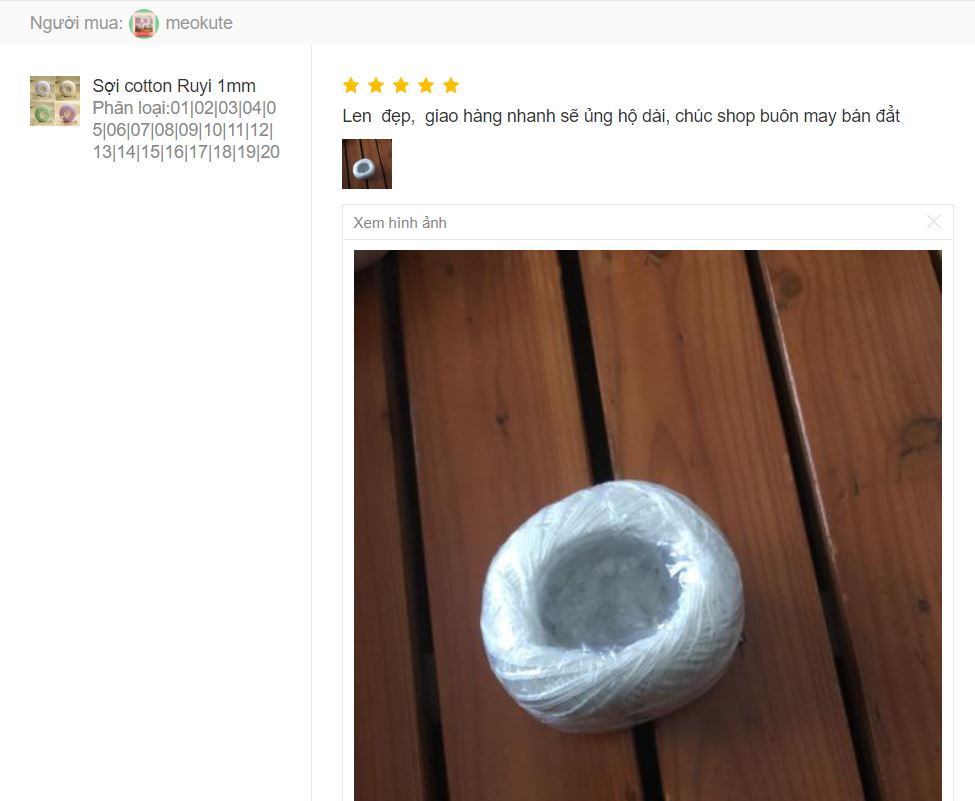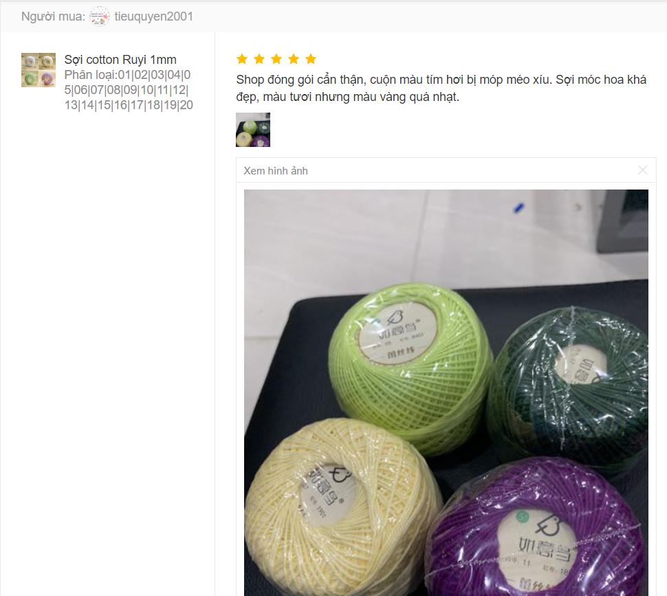 Trả lời: Do sợi thuộc hàng nội địa Trung nên chất lượng tương đối tốt, mỗi cuộn sợi ruyi 1.0mm được bọc trong 1 túi bóng kính chắc chắn ngăn ngấm nước hay bụi bẩn trong quá trình vận chuyển hay sử dụng. Màu sắc cực kỳ ổn định qua từng lô hàng. Sản phẩm có mã màu và tem mác rõ ràng nên giúp các bạn nhận biết màu sắc và tránh mua nhầm qua nhiều lần mua hàng.