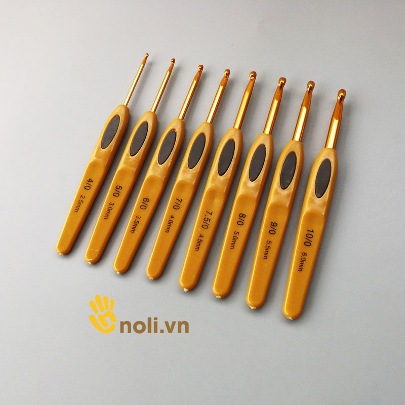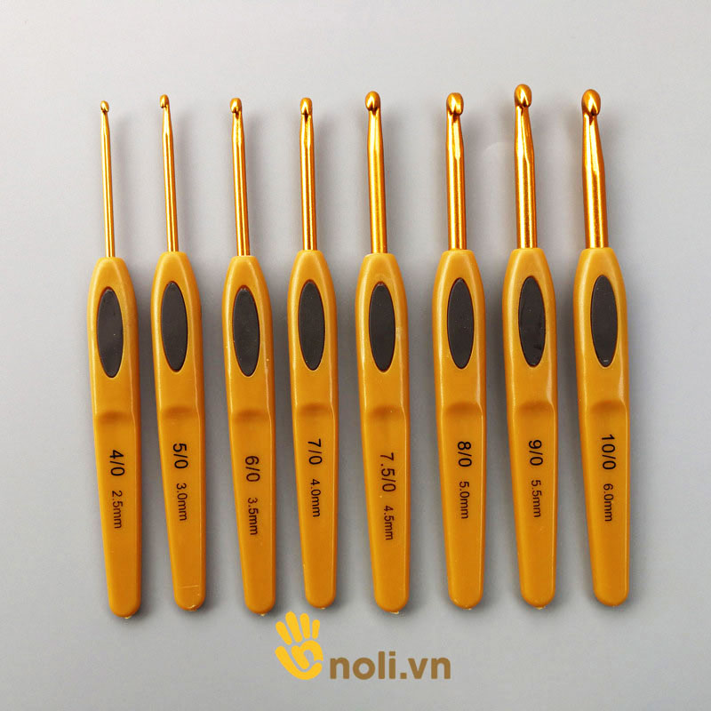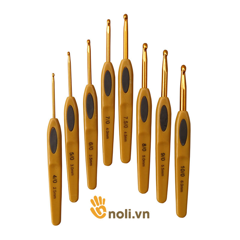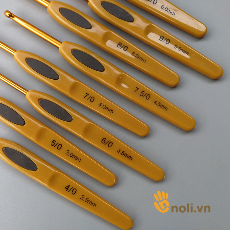 Bộ kim móc mô phỏng clover được thiết kế theo bộ kim móc nổi tiếng Clover Nhật. Chúng có cán cầm dẹt, màu vàng nâu đặc trưng, và trên thân kim có hình oval màu đen nhám. Đầu móc bằng nhôm mạ vàng nhẹ tênh, giúp các bạn cầm kim không mỏi tay. Bộ kim móc đang được rất nhiều chị em yêu thích bởi giá thành phải chăng, hợp túi tiền. Bộ kim móc chạy size từ 2.5mm đến 6.0mm, phù hợp với mọi loại len sợi.