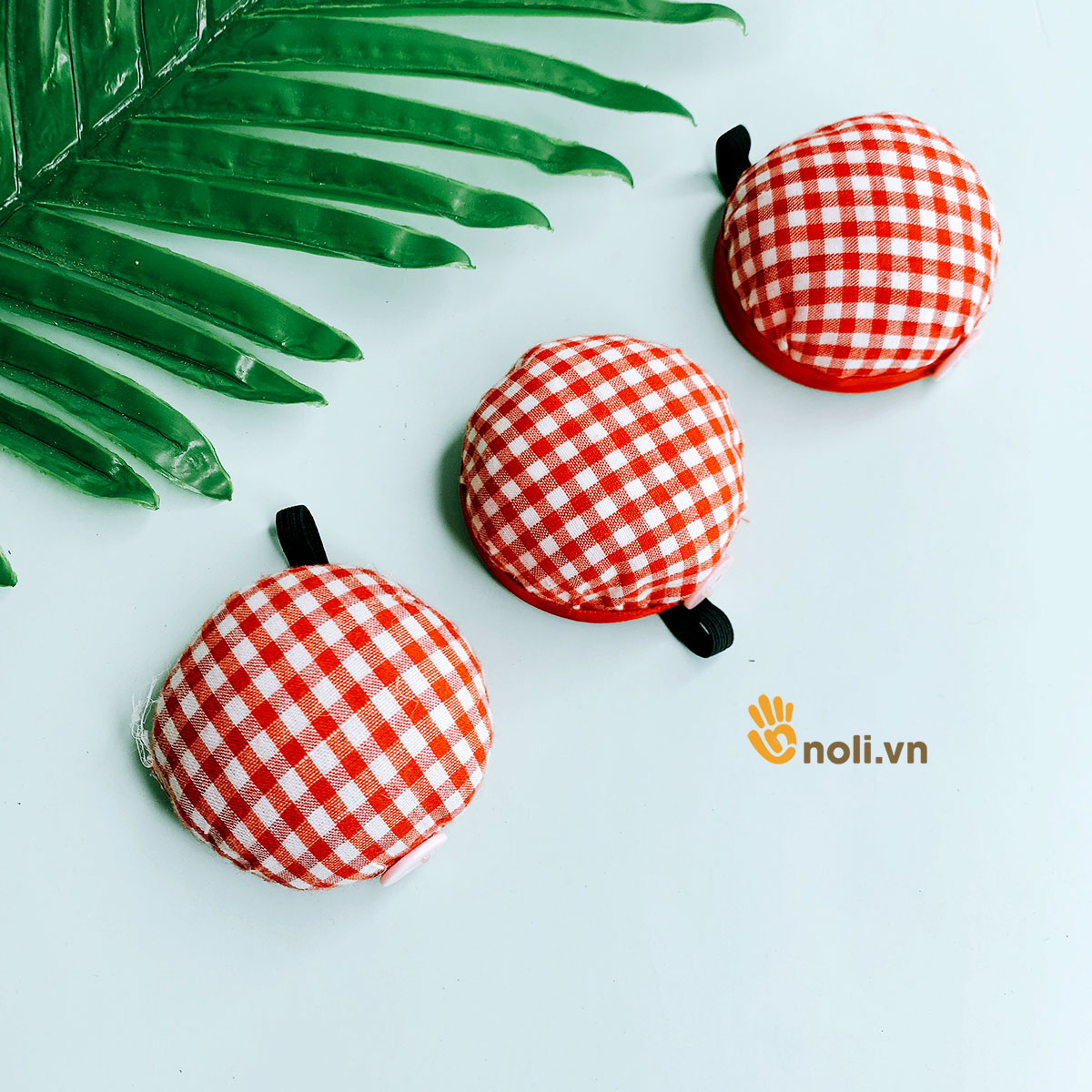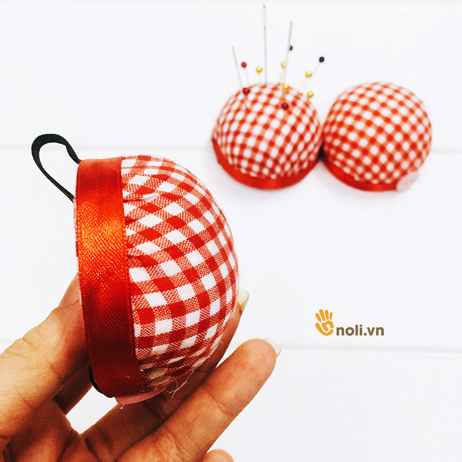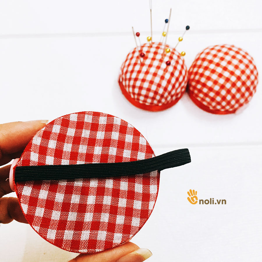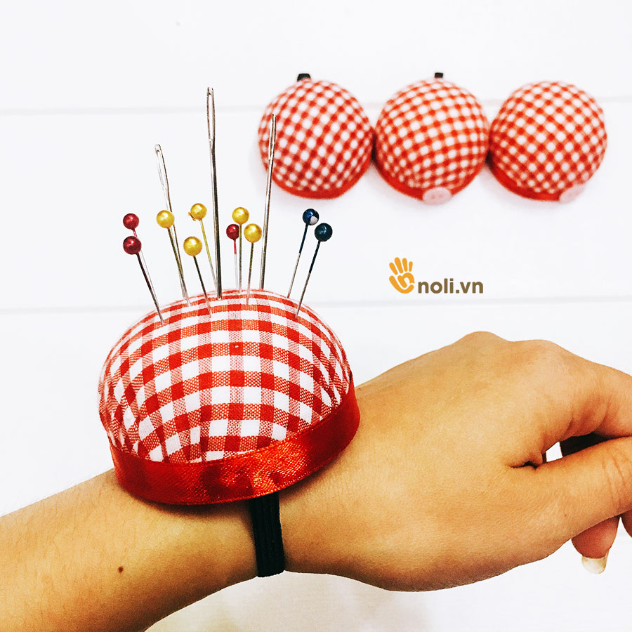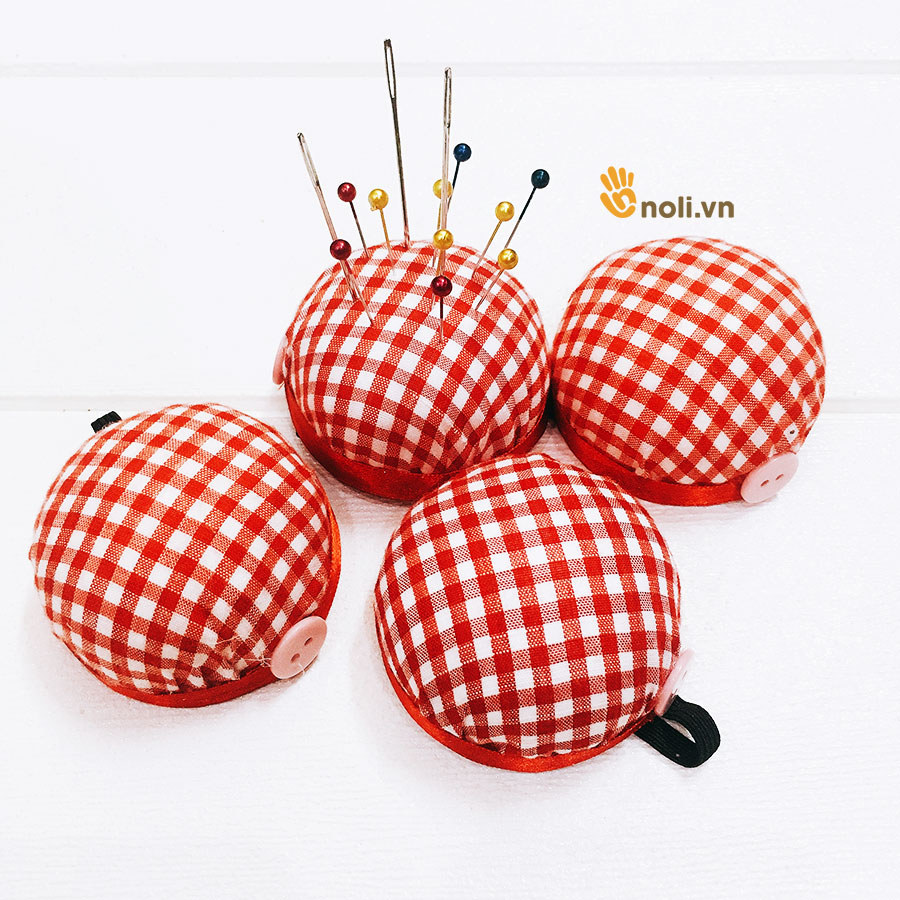 Đế cắm kim khâu, ghim định vị có vỏ ngoài là lớp vải caro. Bên trong là xốp giúp cắm kim khâu lên. Mặt dưới có chun co giãn. Có thể cho vào cổ tay rất tiện lợi.Sản phẩm có đường kính khoảng 6cm, chiều cao 3.5cm, dây đeo cổ tay 0.5cm.