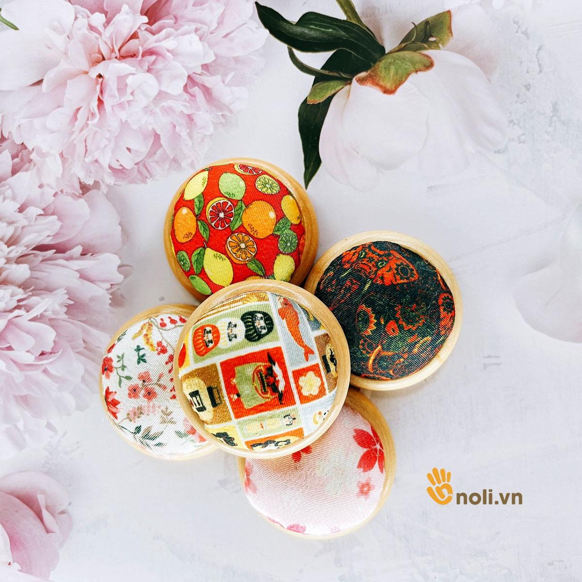 Đế cắm kim khâu chân gỗ là sản phẩm không thể thiếu của chị em handmade. Đế giúp lưu giữ nhanh chóng những chiếc kim khâu, ghim định vị. Chị em trong quá trình làm đồ thủ công sẽ cảm thấy tiện lợi hơn và tránh mất đồ. Mặt trên của đế cắm kim được bọc 1 lớp vải với hoạ tiết xinh xắn, giúp cắm kim khâu lên dễ dàng. Mặt dưới có đế gỗ phẳng, rắt chắc chắn. Đường kính đế 7cm, nhẹ nhàng, vừa tay và tiện lợi khi bỏ túi mang theo.