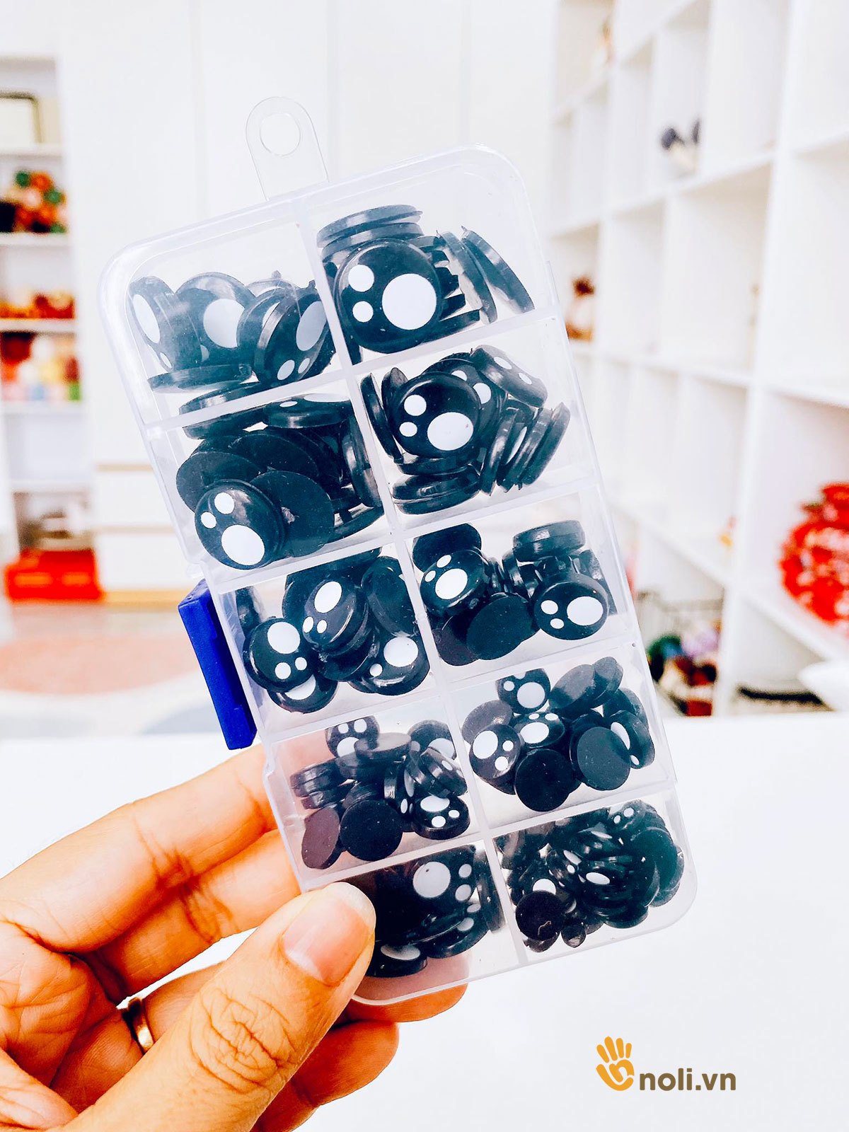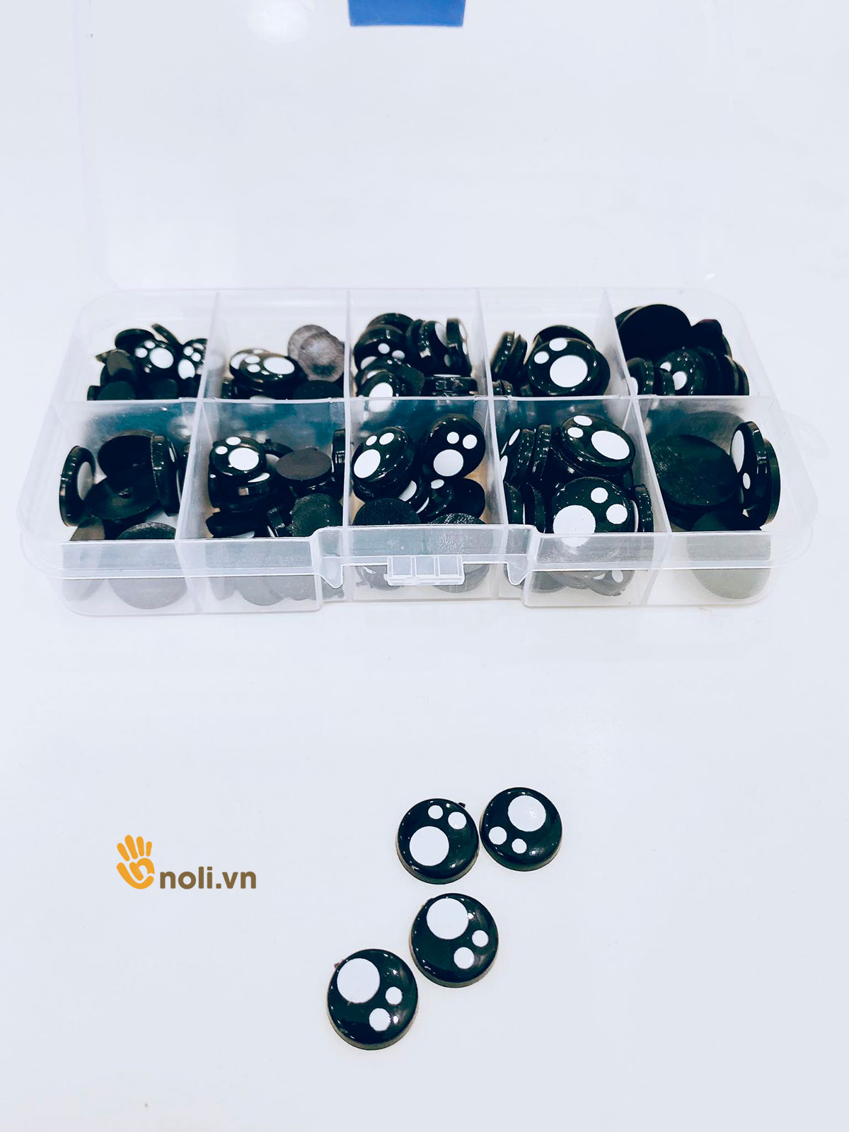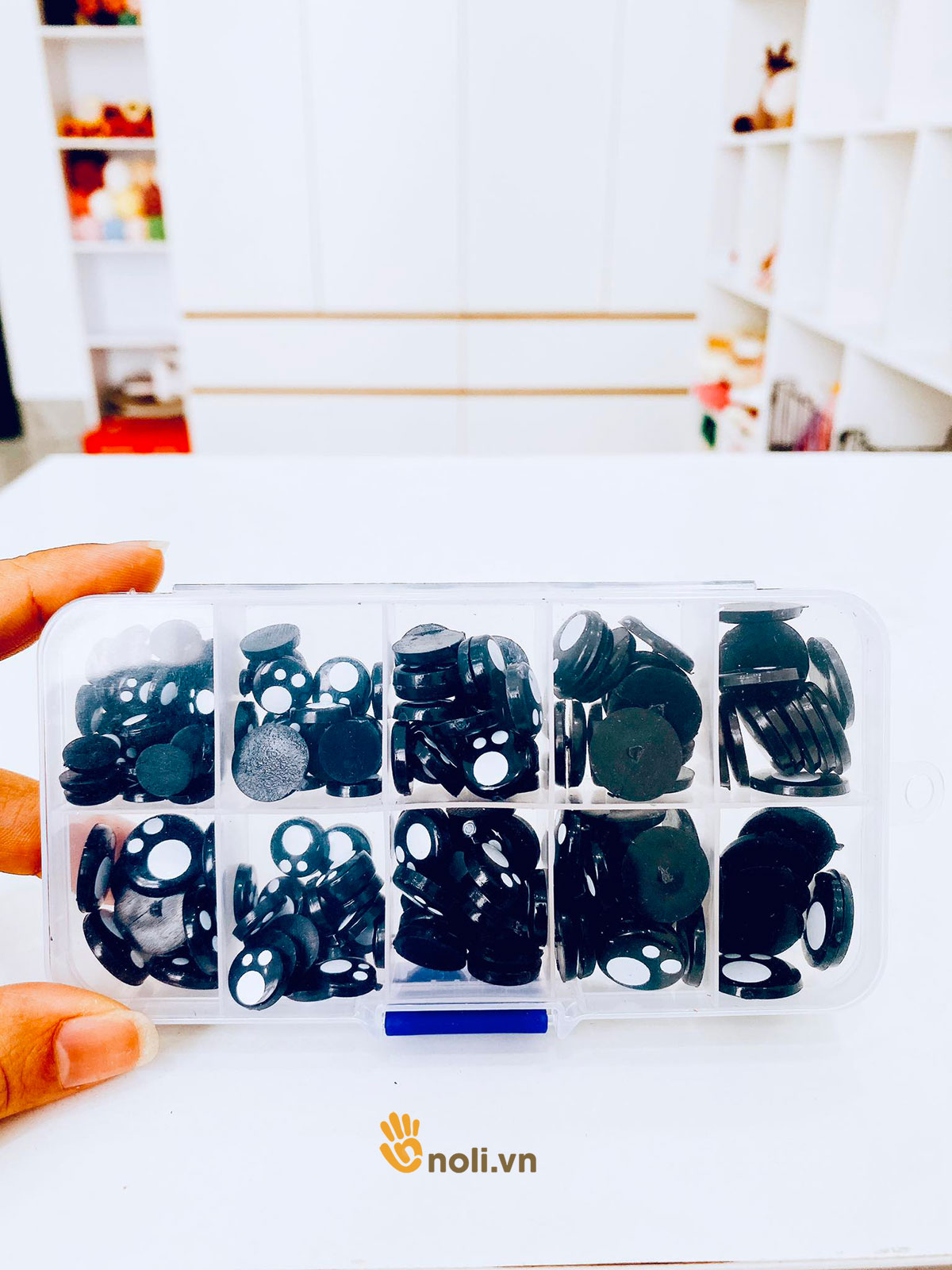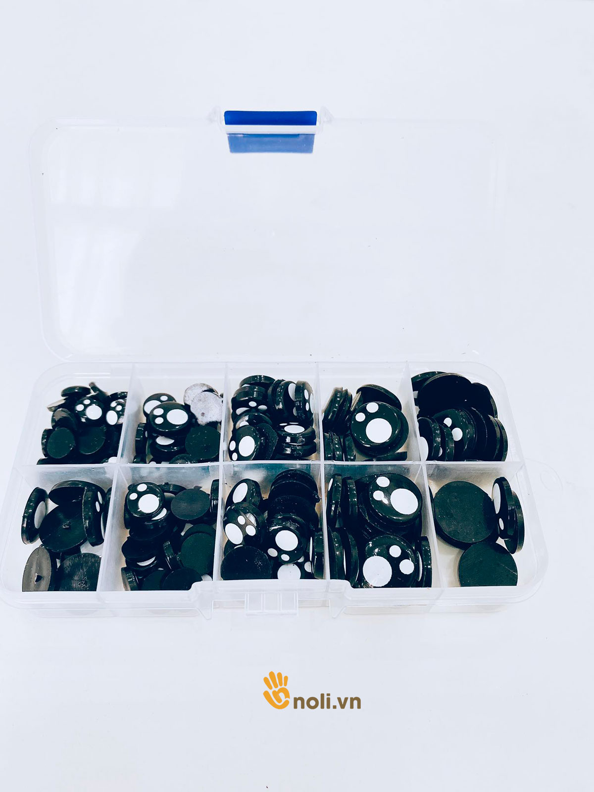 Hộp mắt thú DÁN an toàn long lanh được chia 10 ngăn gọn gàng. Mỗi ngăn là các size mắt khác nhau từ lớn đến nhỏ, phù hợp với mọi loại thú. Mắt dán tiện lợi.