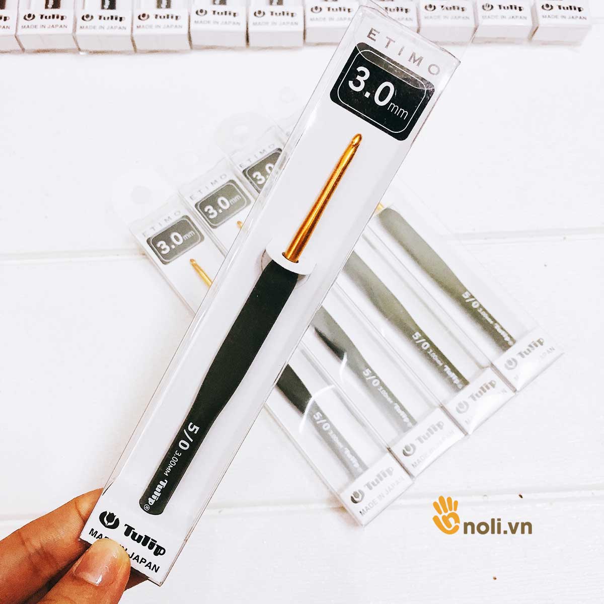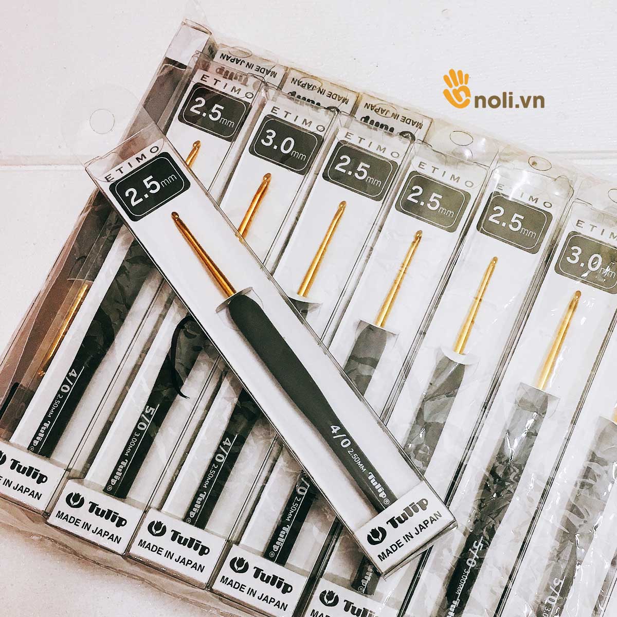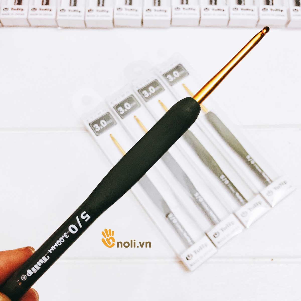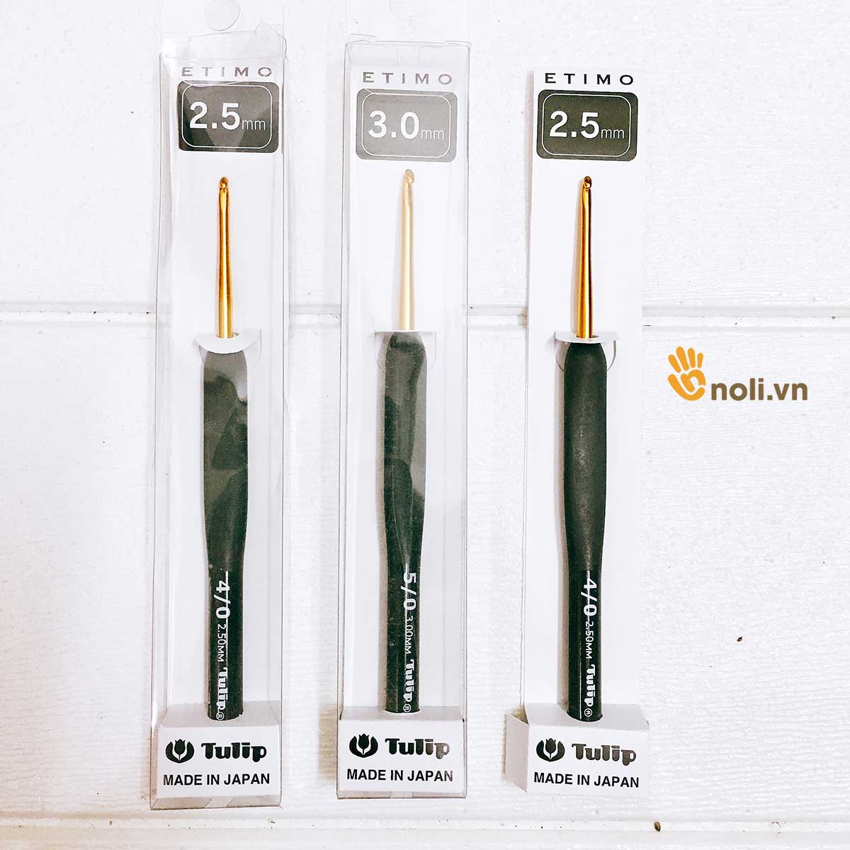 Đầu kim có màu vàng nên gọi là kim Tuylip Gold. Cán kim móc có màu đen xám khói. Cán mềm, cầm êm tay. Thích hợp cho các bạn thích cầm kim cán tròn. Kim nhà em có 2 size phổ biến hay sử dụng: 2.5mm và 3mm