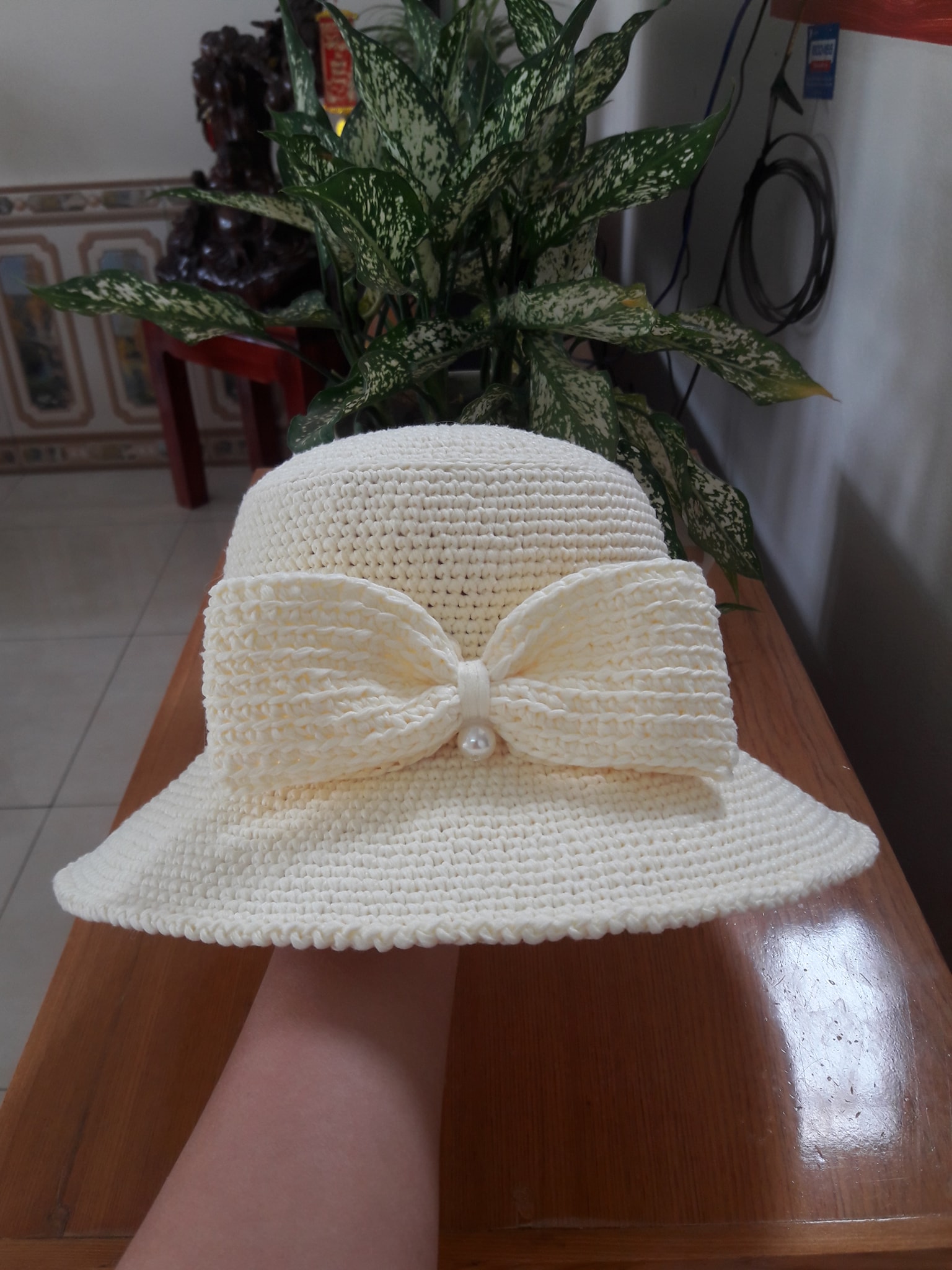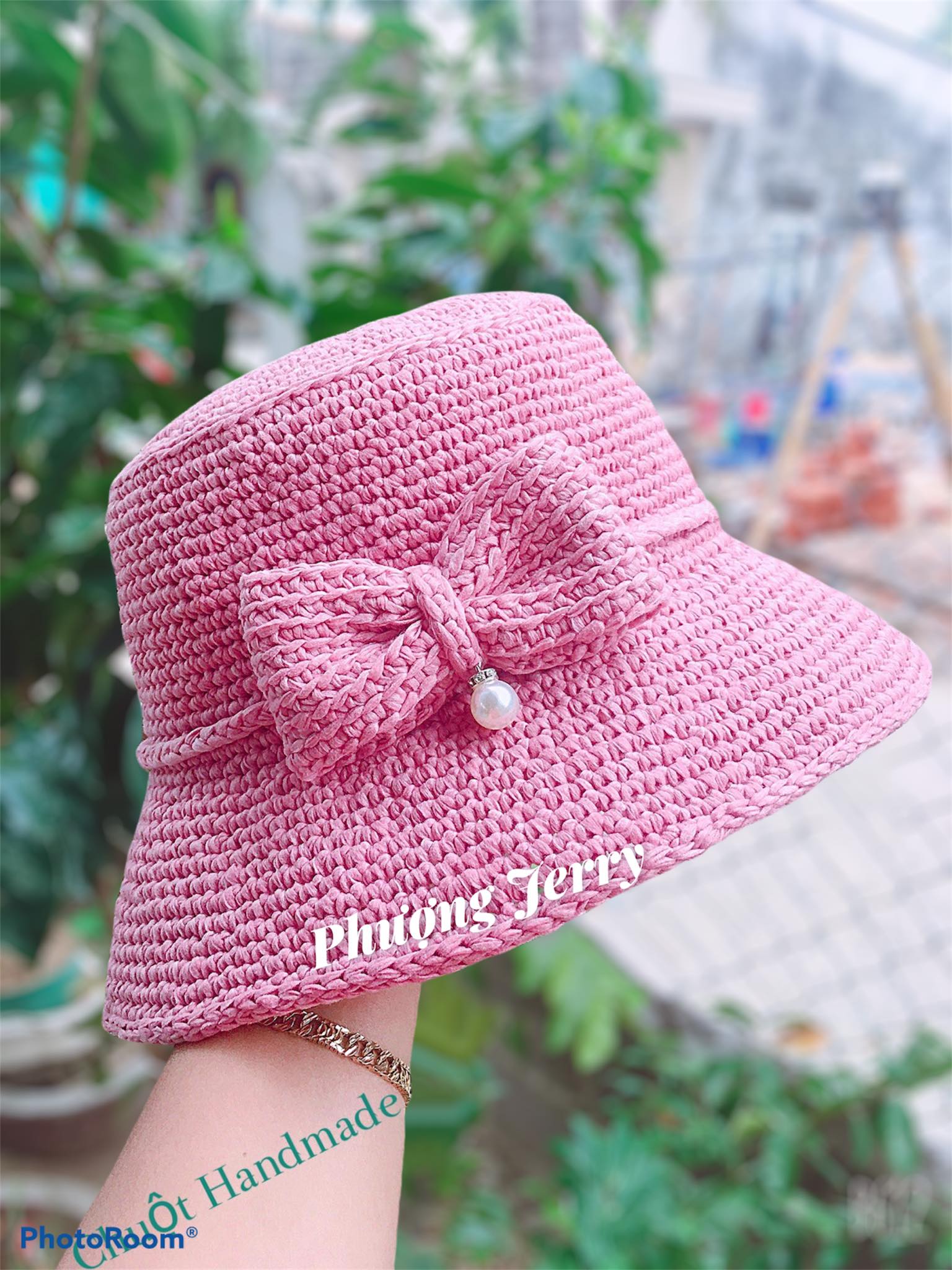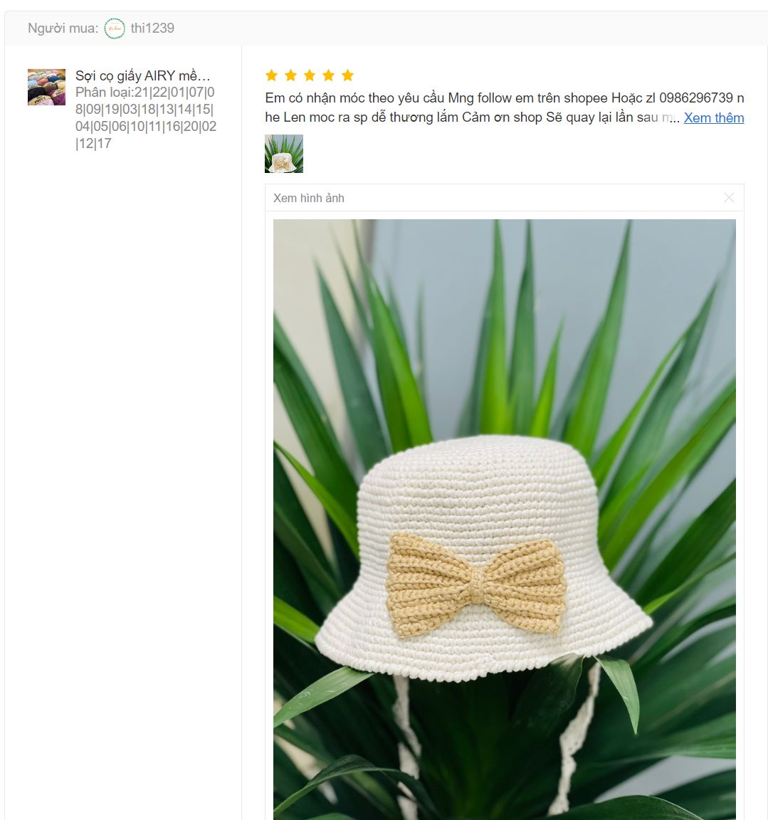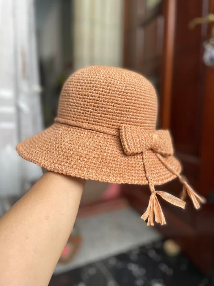 Trả lời: Với thành phẩm là mũ người lớn vành nhỏ thì chị em cần sử dụng hết khoảng 4 cuộn , hoặc hơn 4 cuộn sợi cọ giấy Airy