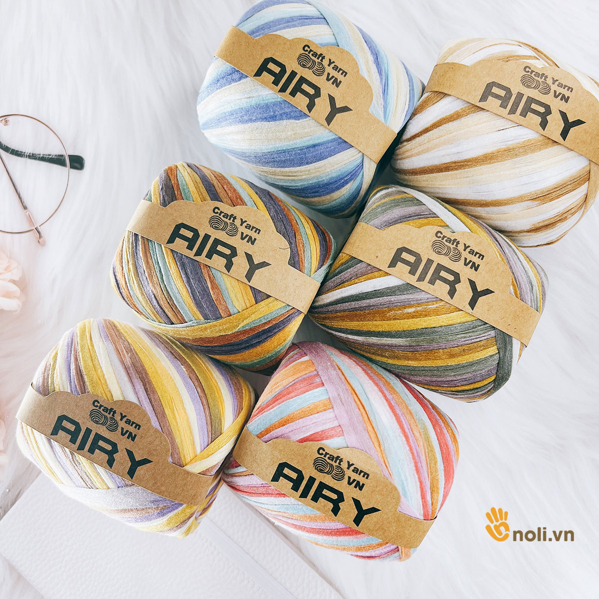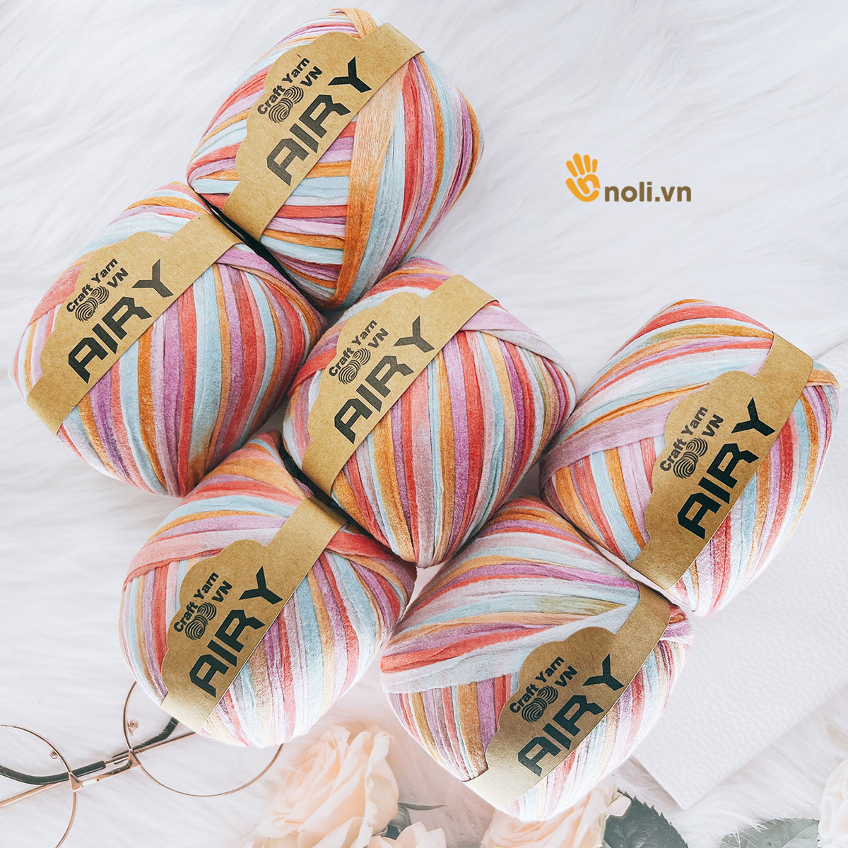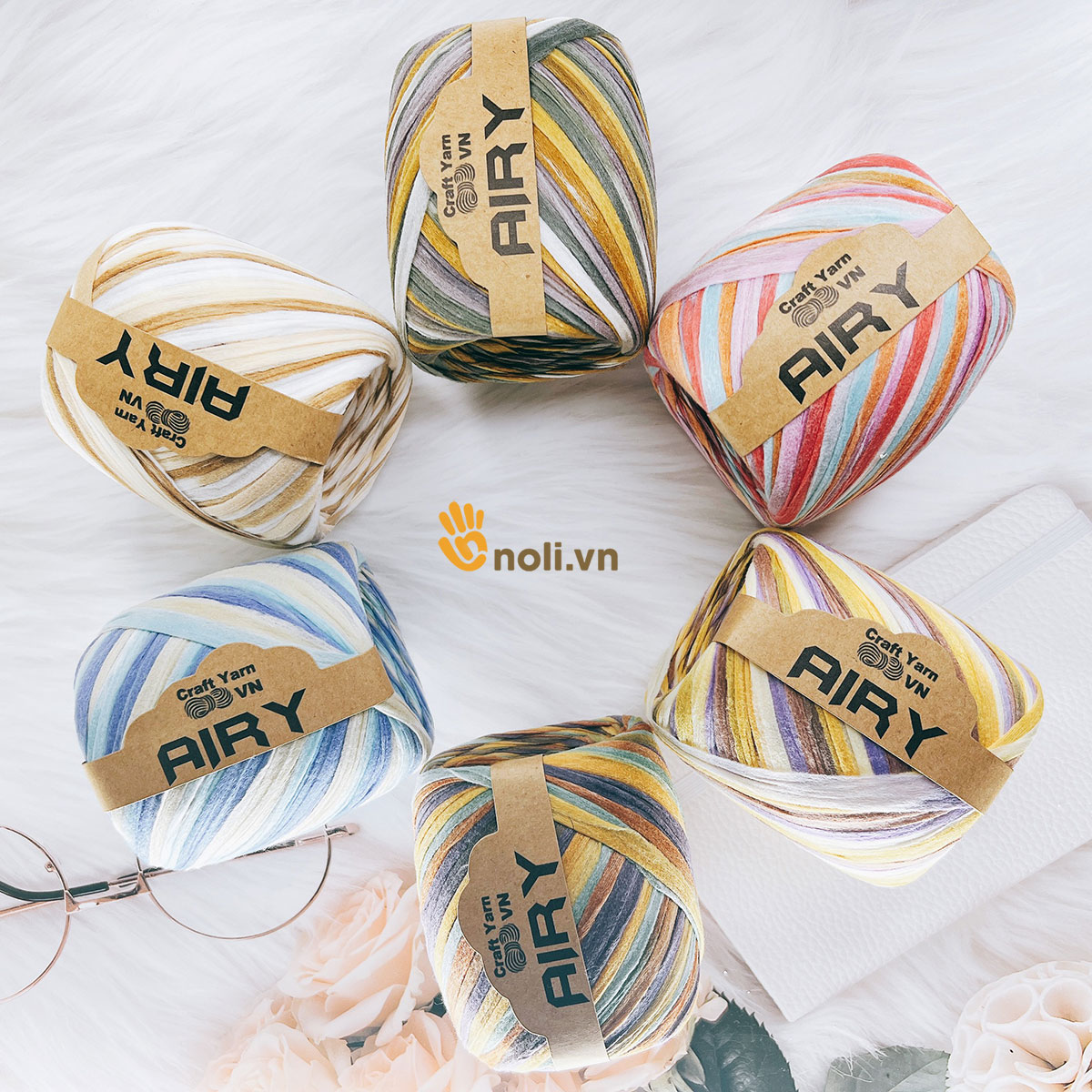 Sợi cọ giấy Airy loang có xuất xứ từ Việt Nam. Sợi mềm mại, siêu nhẹ chuyên để đan móc túi xách, túi đựng điện thoại, túi tote đi biển, mũ nón có vành mùa hè. Sợi có bảng màu 12 mã, màu sắc pastel kết hợp với phối màu giúp cho sản phẩm trở nên độc đáo, vintage ưa mắt tới người nhìn hơn