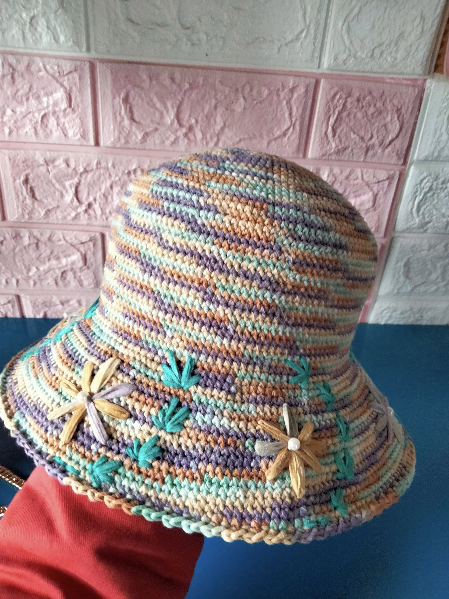 Trả lời: Với thành phẩm là mũ người lớn vành nhỏ thì chị em cần sử dụng hết khoảng 4 cuộn , hoặc hơn 4 cuộn sợi cọ giấy Airy loang